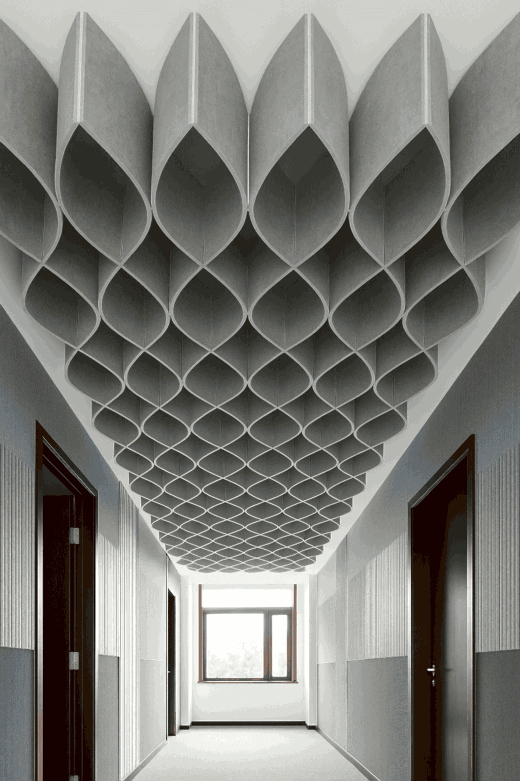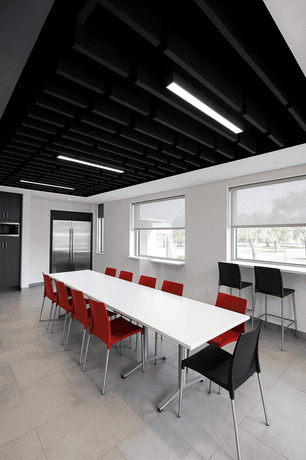 Tavana dikey olarak sarkıtılan bu akustik baffle paneller, ortamdaki ses dalgalarının yansımasını azaltarak daha dengeli ve konforlu bir akustik ortam sunar. Kullanılan acoustic baffle material, geri dönüştürülebilir PET esaslı yoğun keçe panel yapısıyla hem çevreci hem de yüksek performanslıdır.