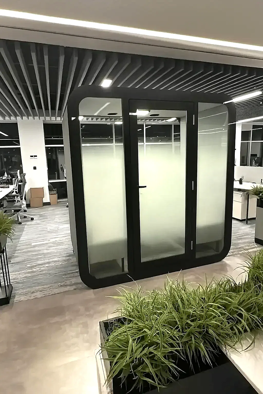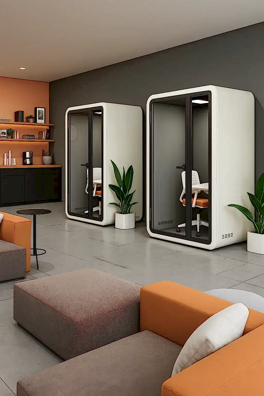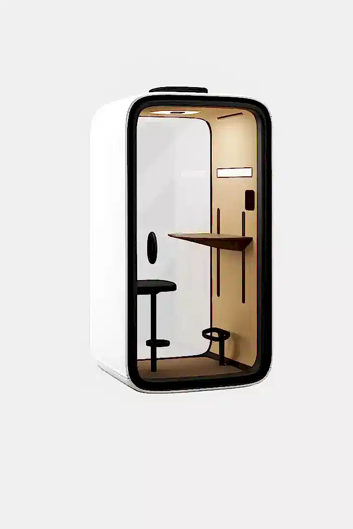 Bu kabin, açık ofis ortamlarında çalışanlara bireysel çalışma, odaklanma ve online toplantılar için sessiz ve izole bir alan sunar. Gürültüyü azaltarak verimliliği artırır ve aynı zamanda özel görüşmelerin mahremiyetini korur.