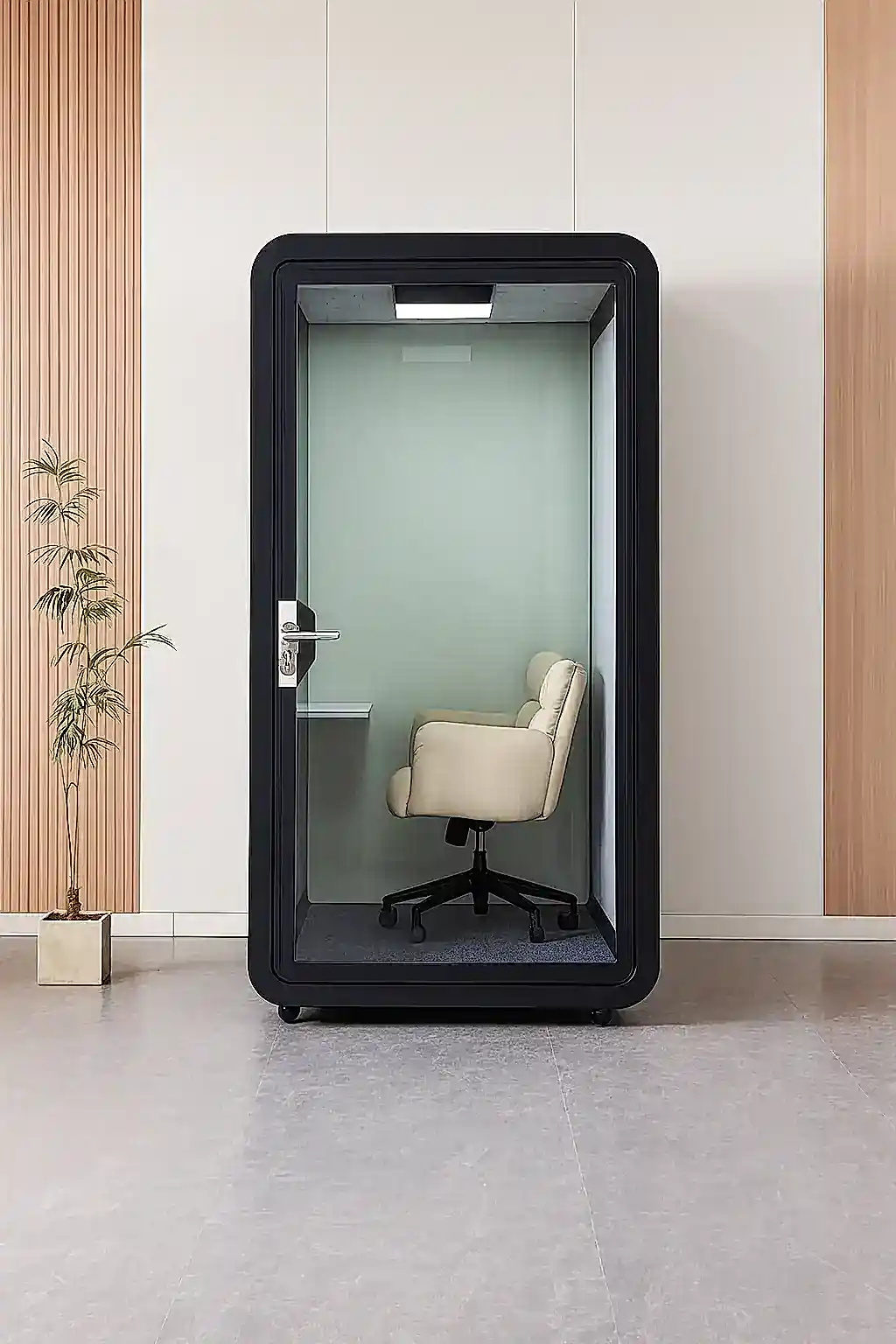 Yüksek ses yalıtımı sunan yapısıyla bu akustik çalışma kabini, dışarıdan gelen sesleri minimuma indirir ve içerideki sesin dışarıya çıkmasını engeller. Böylece hem çalışan gizliliğini sağlar hem de ortam akustiğini kontrol altında tutar. Ofis kabinleri arasında hem şıklığı hem de teknolojik altyapısı ile öne çıkan bu model, bireysel görevler, çevrimiçi toplantılar ve yaratıcı çalışmalar için ideal ortam sunar.