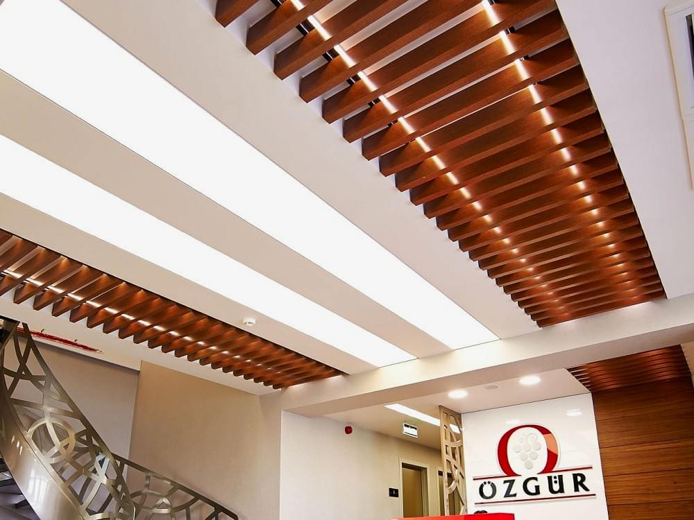 Linear Asma Tavan Sistemleri Ayrıcalıkları : Lineer Ahşap Asma Tavan Sistemleri, mimar ve tasarımcıları özel tavan sistemleri tasarlamalarında özgür kılıyor. Sistem, iç ve dış mekan uygulamaları için geniş bir tasarım özgünlüğü sağlıyor. İçbükey, dışbükey ve dalgalı tavan bölümleri, farklı geometrilerde özel çözümler ve özel tasarlanmış süspansiyon sistemi sayesinde kolaylıkla oluşturulabiliyor. Sistem, düz ve geniş alanlar, dış mekanlar ve yüzme havuzu alanları da dahil olmak üzere tüm durumlarda panellerin terazide ve düzgün kalmasını sağlayacak şekilde dizayn edilmiş. Ahşap cinsi seçenekleri de kızıl sedir ve maun gibi derin sıcak renklerden başlayarak kavak ve akçaağaç gibi daha hafif tonlara varan geniş bir yelpazede sunulmakta.